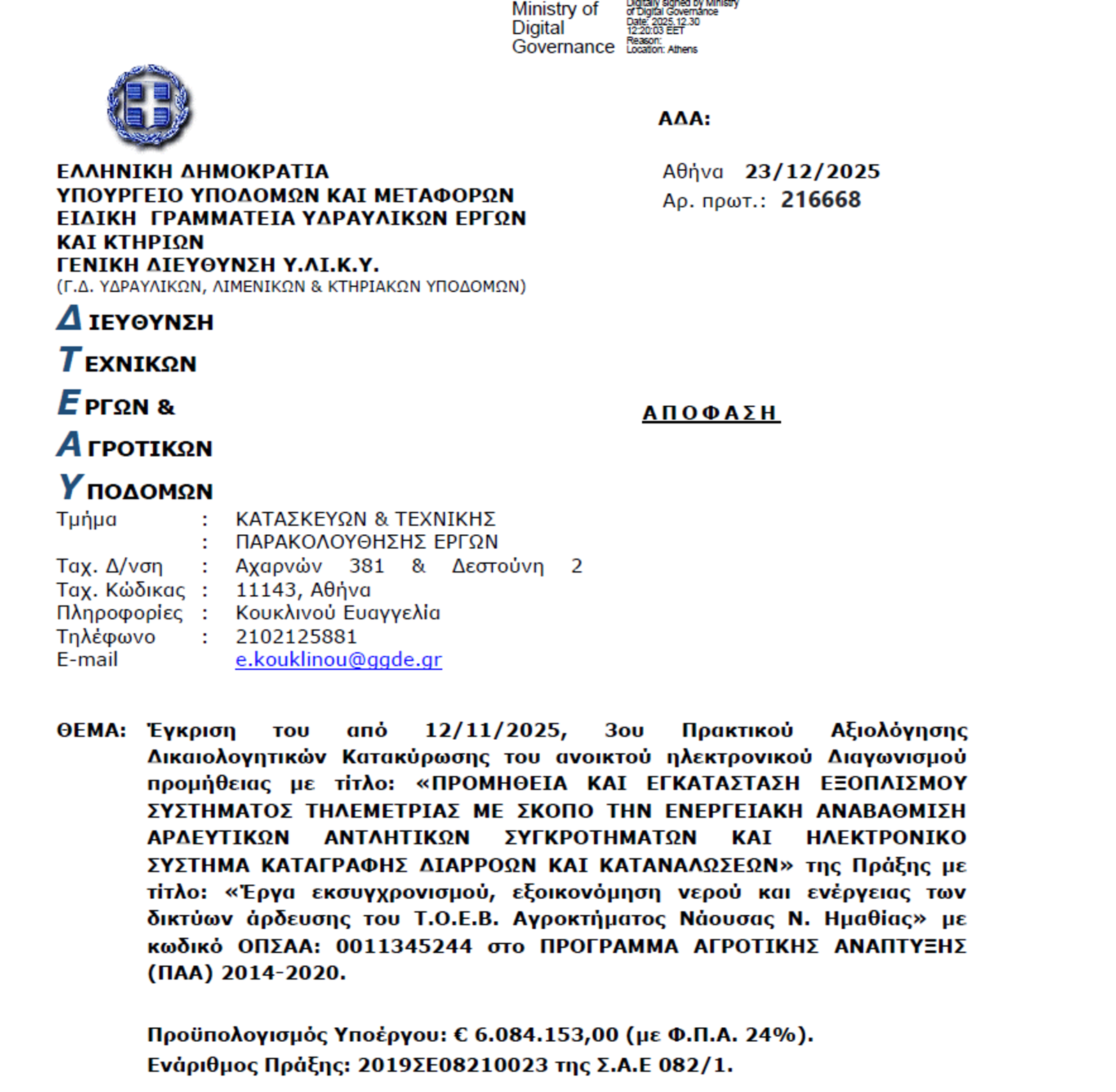 Αγροκτήματος Νάουσας Ν. Ημαθίας» με προϋπολογισμό δημοπράτησης: 6.084.153,00 €
