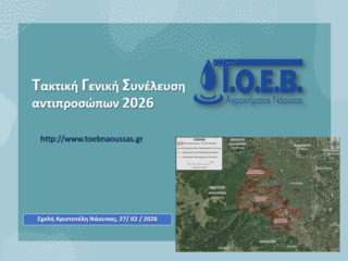Σε τακτική Γενική Συνέλευση όλους τους Αντιπροσώπους του Τ.Ο.Ε.Β. Αγροκτήματος Ναούσης την 27η του μηνός Φεβρουαρίου 2025, ημέρα Παρασκευή και ώρα 6.00 μ.μ. στην αίθουσα του Πολιτιστικού Κέντρου της Σχολής Αριστοτέλη, για συζήτηση και λήψη αποφάσεων στα παρακάτω θέματα :