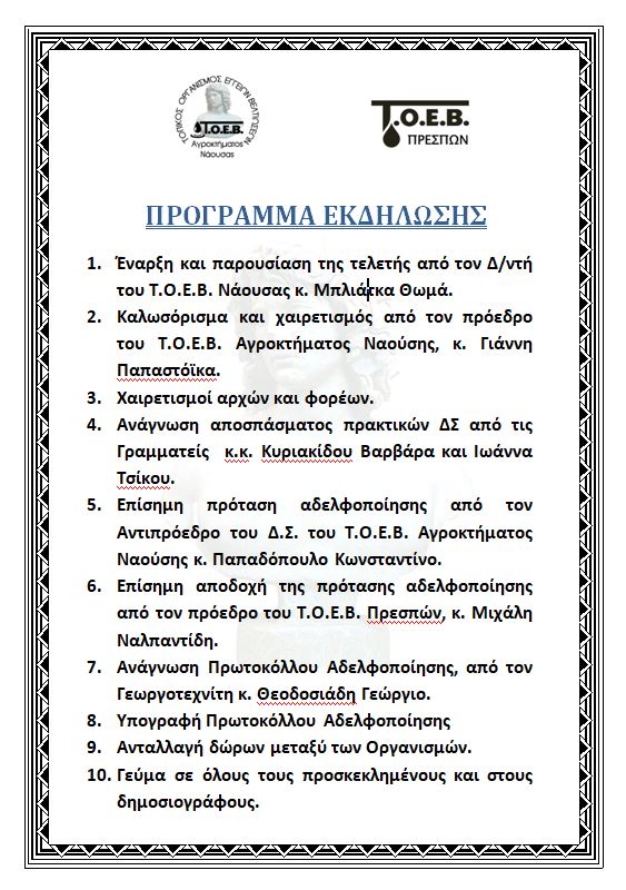 Στο πλαίσιο των συζητήσεων αυτών και των σκέψεων που ανταλλάξαμε για ευρύτερη συνεργασία των ΤΟΕΒ Αγροκτήματος Ναούσης και Πρεσπών, είμαι στην ευχάριστη θέση να σας μεταφέρω την 111/2017 απόφαση του Διοικητικού Συμβουλίου του ΤΟΕΒ Αγροκτήματος Ναούσης για να προχωρήσει η αδελφοποίηση και η συνεργασία μας η οποία θα αποβλέπει στην ανάπτυξη των σχέσεων μας σε επίπεδα: Τεχνογνωσίας, Ανάπτυξης των καλλιεργειών και Διεκδίκησης. Πρόθεση μας είναι η συνεργασία αυτή να προχωρήσει και μάλιστα άμεσα, διαπιστώνοντας και οι δυο πλευρές ότι τα κοινά σημεία δράσεων της Νάουσας και των Πρεσπών είναι πάρα πολλά.